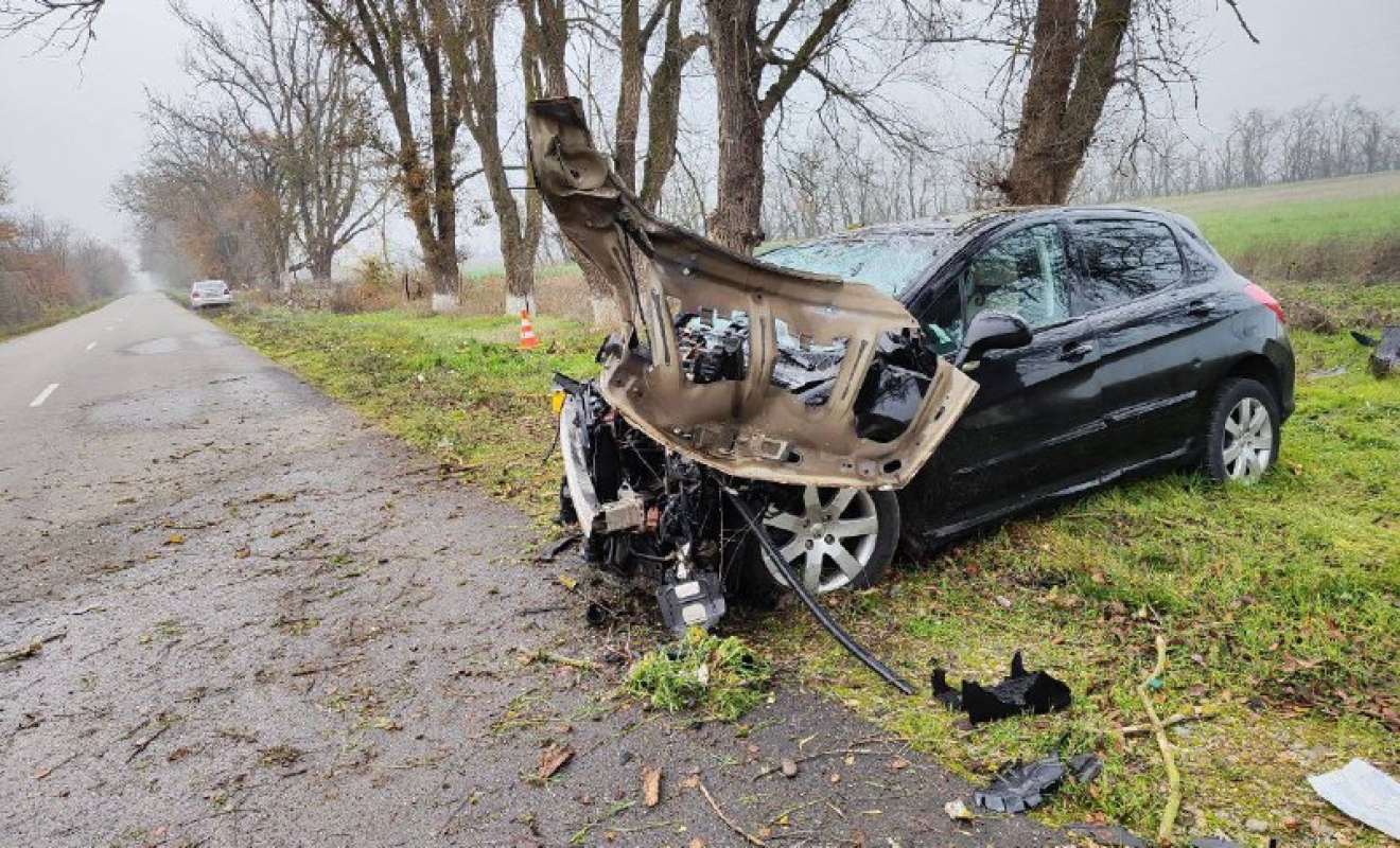 Водитель легкового «Пежо» не справился с управлением и допустил съезд автомобиля с дороги. Затем машина врезалась в препятствие в виде столбика дорожного расстояния.