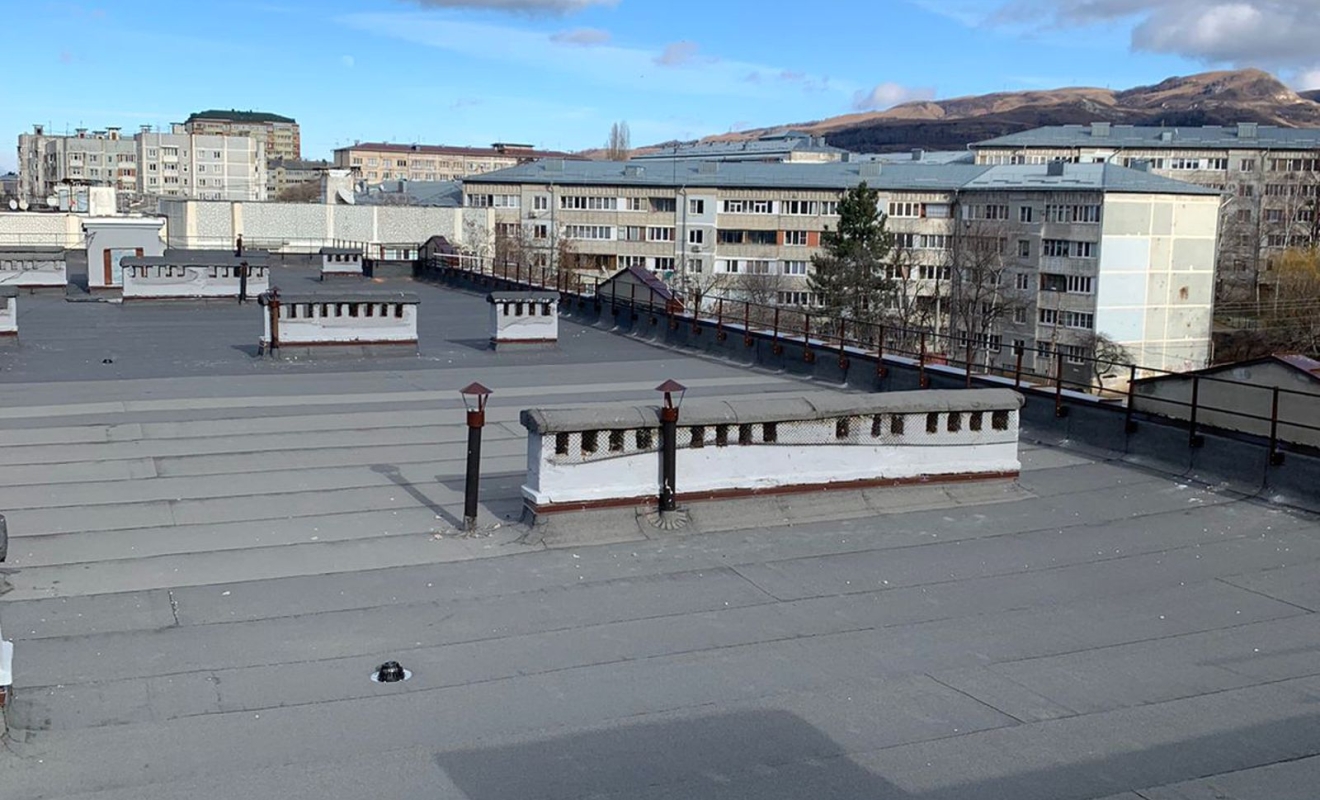 Капитальный ремонт выполнен по полной технологической схеме. Старое покрытие демонтировано, основание выровнено и загрунтовано, после чего смонтировано новое наплавляемое покрытие в три слоя. Использованы материалы, рассчитанные на интенсивные осадки, ультрафиолет и резкие температурные колебания — факторы, которые в курортном климате Кисловодска играют решающую роль. Параллельно восстановлены вентиляционные каналы, установлены водосточные системы и кровельные ограждения — элементы, незаметные в повседневной жизни, но критически важные для безопасной эксплуатации.