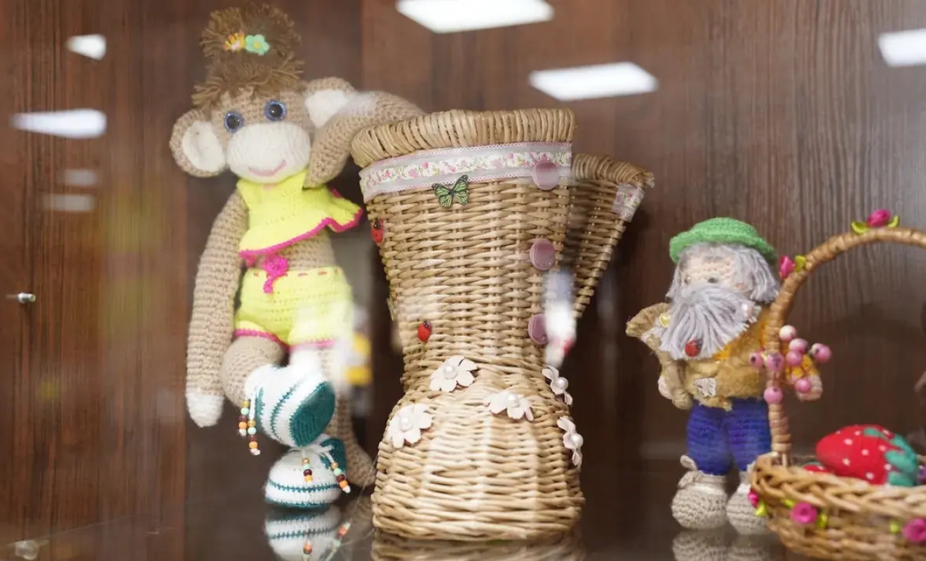 В экспозиции представлены корзинки, кашпо, деревья и вязаные игрушки и авторские куклы.
